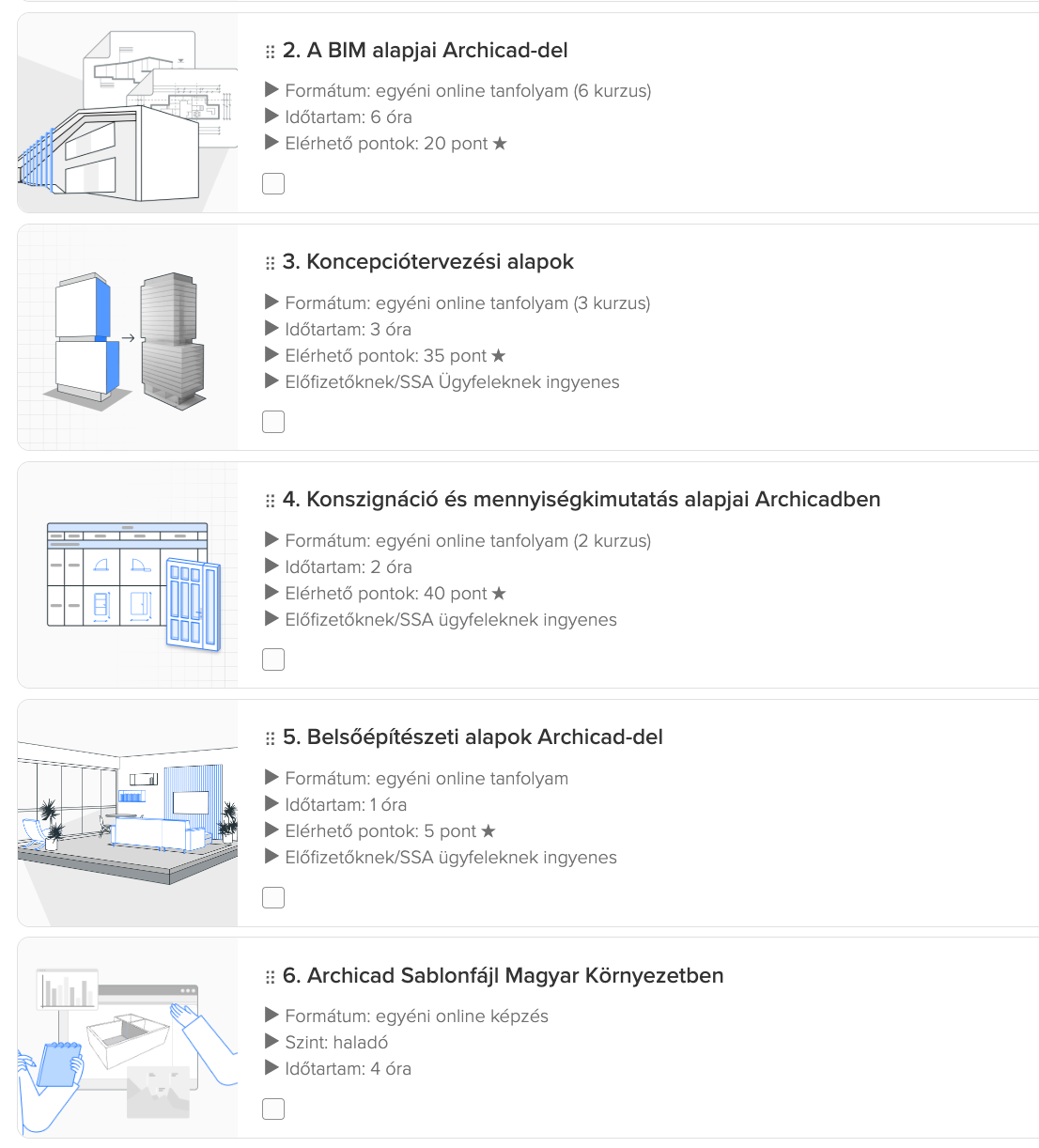 A BIMFIT Plusz kártya keretében alapszintű és haladó szintű kurzusokat érhet el. A kurzusok egy része önállóan végezhető, míg mások oktató által vezetett tréningek. Az oktató által vezetett tréningeket kb félévente hirdetjük meg a felhasználók igényeinek ismeretében, így mindig az aktuális szakmai elvárásokhoz igazodnak.